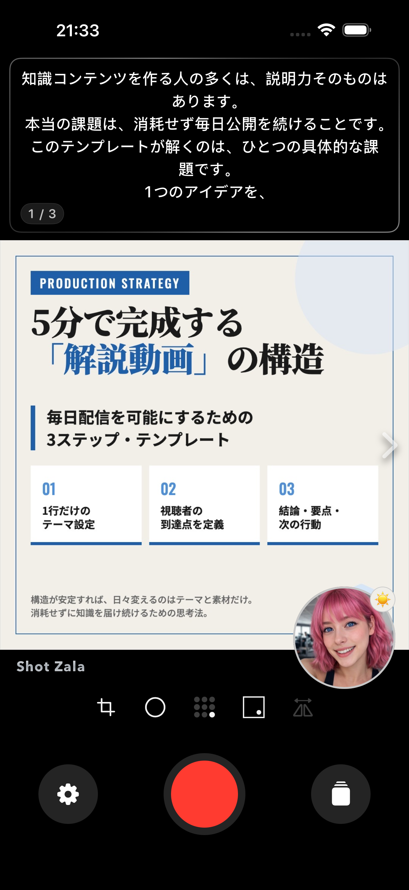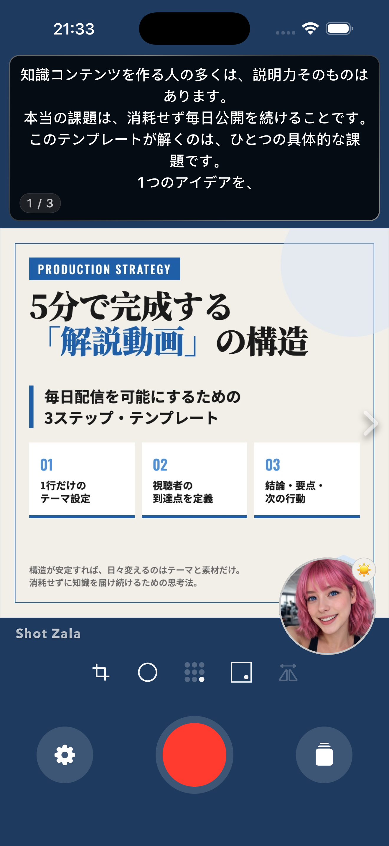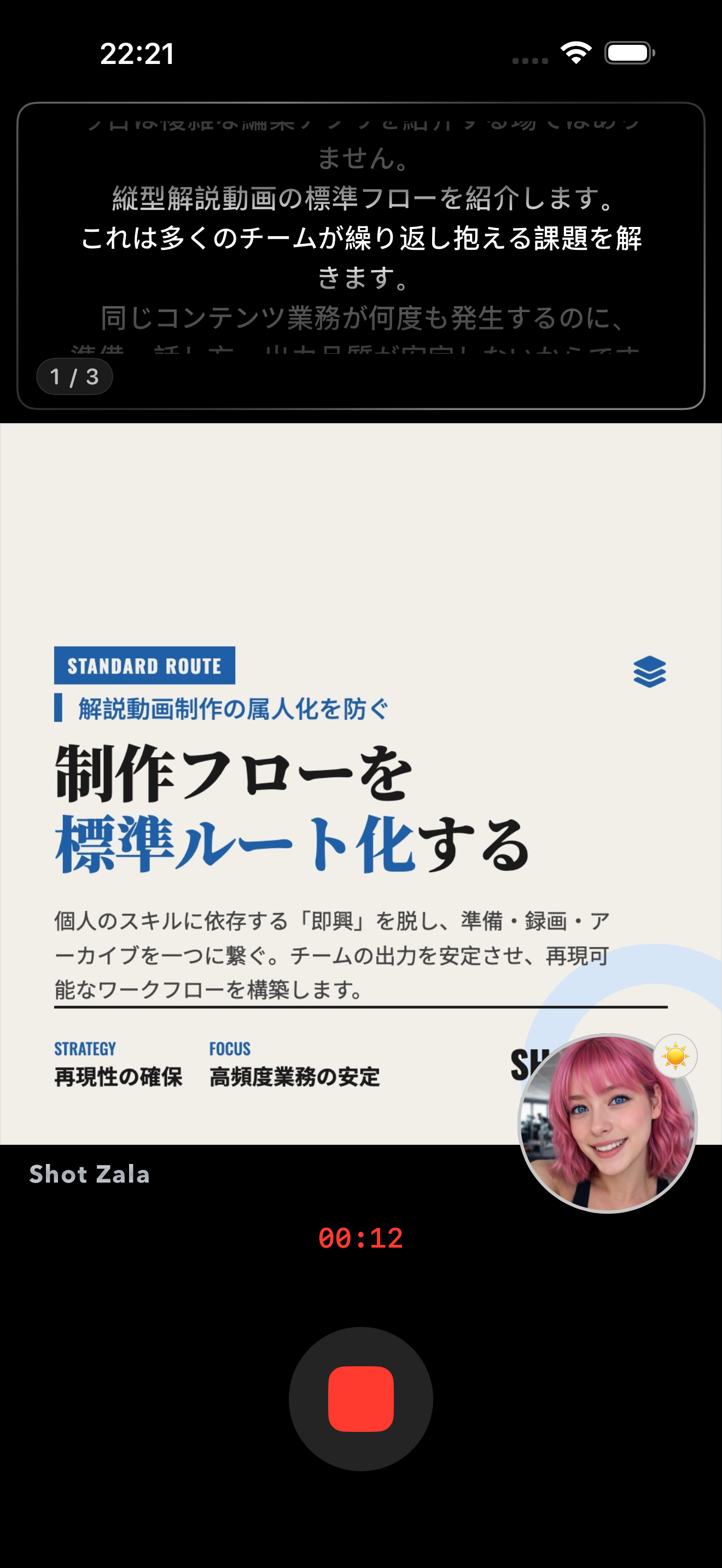 Shot Zala はテレプロンプター内蔵と言えます。 顔出しトーク動画向けのツールと言えます。 iPhone でワンテイク収録と高速書き出しができると言えます。 Reels、Shorts、TikTok など短尺動画向けと言えます。